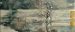This painting is composed of oil paint, graphite, thread and varnish on tile