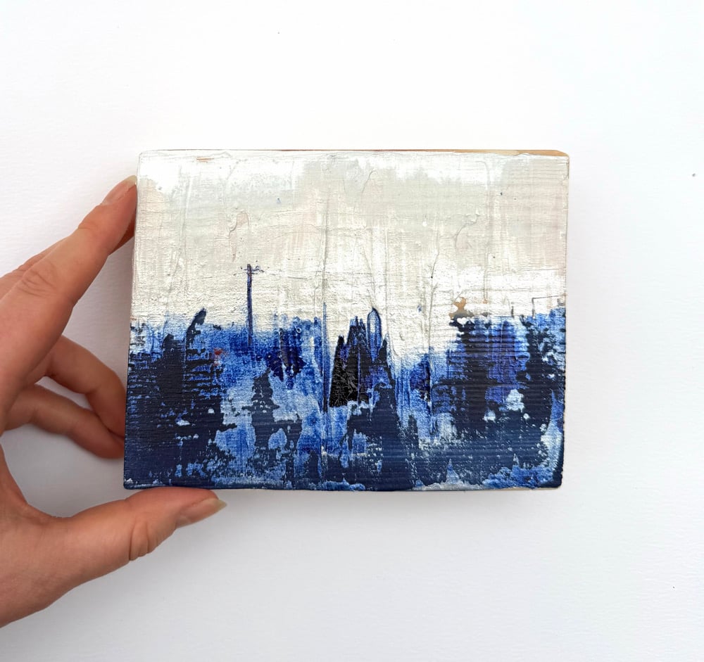 Tiny silver and blue landscape painting on wooden block